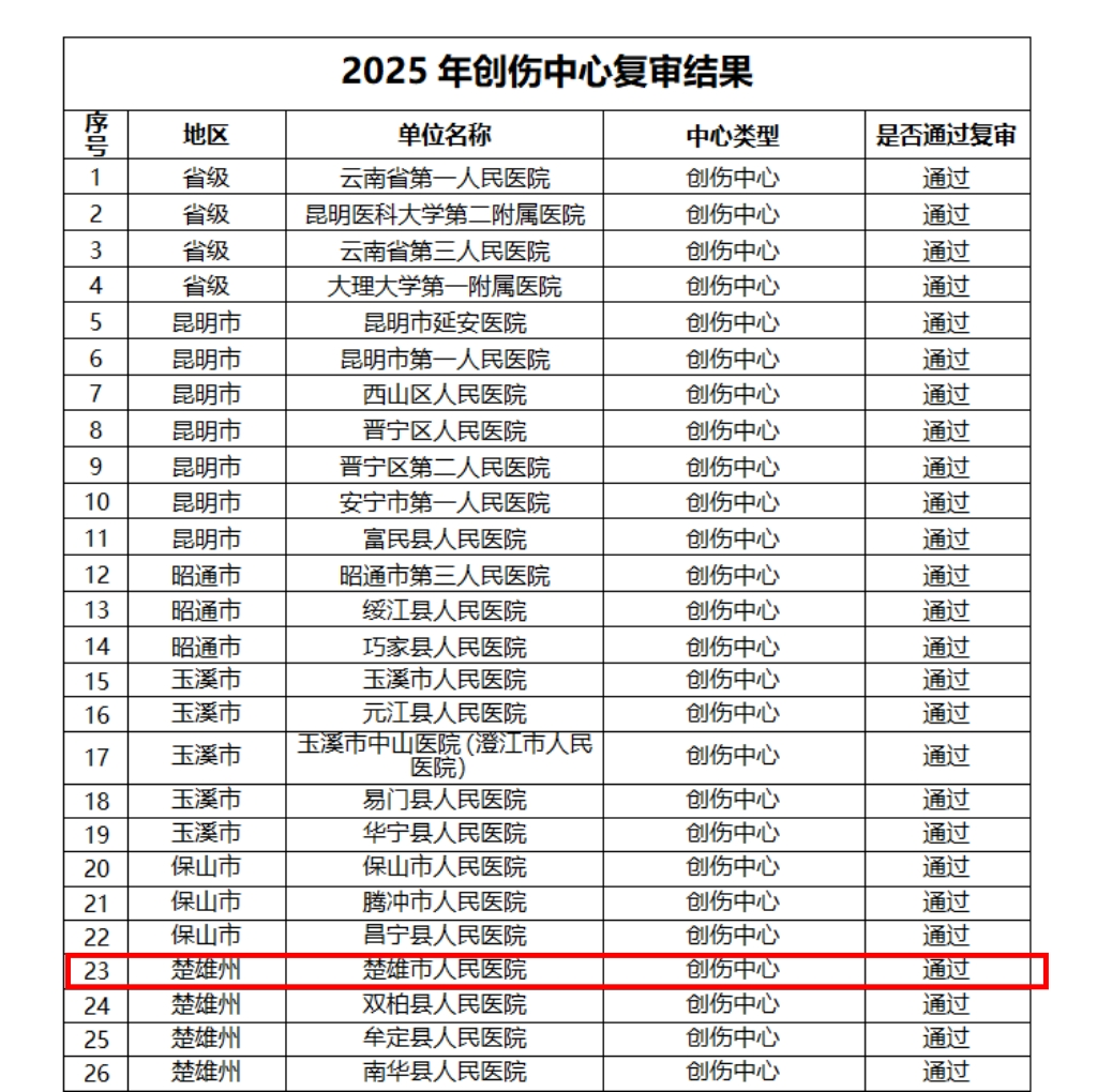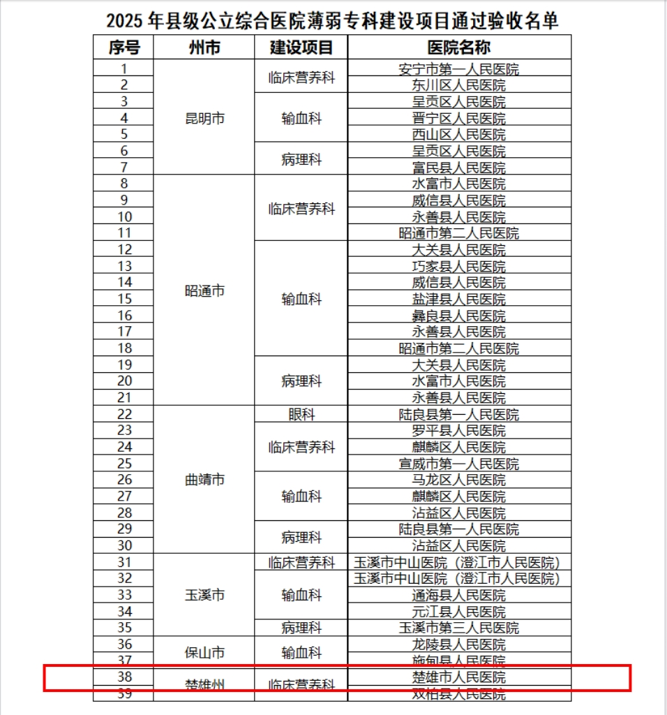 10月20日,云南省卫生健康委员会发布公示,楚雄市人民医院临床服务“五大中心”、临床营养科薄弱专科建设项目顺利通过省级验收,创伤中心亦成功通过云南省医疗服务质量评估中心的复审。