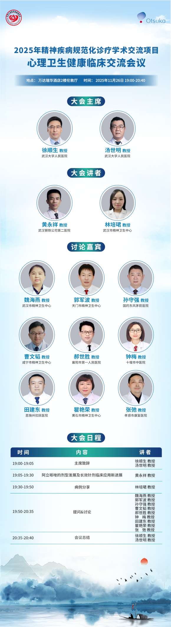 2025年11月26日晚,由北京大地医疗慈善基金会主办、湖北省精神医学领域多位权威专家共同参与的“2025年精神疾病规范化诊疗学术交流项目——心理卫生健康临床交流会议”在武汉市顺利召开。本次会议由武汉大学人民医院徐顺生教授和汤世明教授共同担任大会主席,汇聚了来自武汉及湖北省内多家医疗机构的二十余位精神卫生领域专家,围绕精神疾病的规范化诊疗及最新临床进展展开了深入探讨。