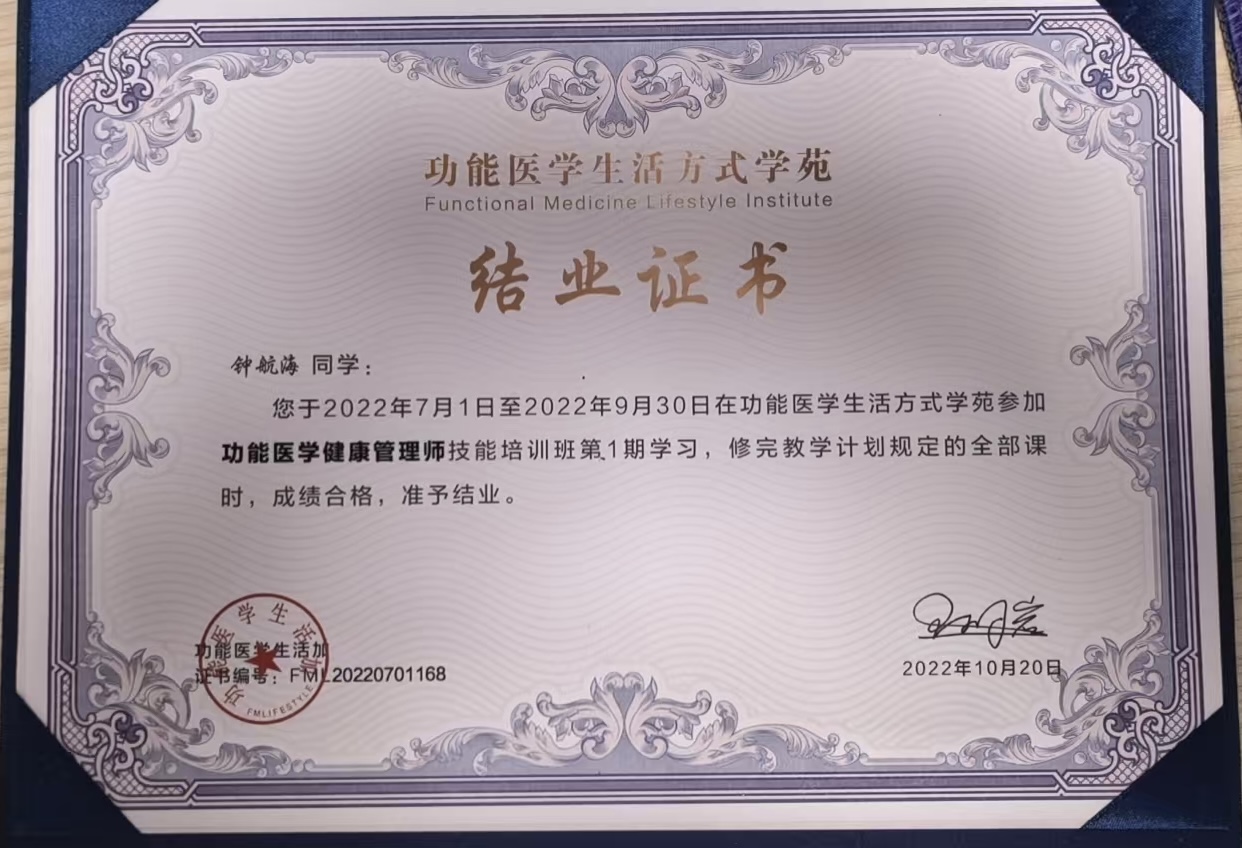 2021年,钟航海荣获九龙坡区华岩镇“优秀共产党员"称号。2022年,他完成功能医学健康管理师培训,实现从临床医学到功能医学的思维转变,对于临床医学难以攻克的慢性疾病,通过功能医学的视角精准调理,帮助众多患者改善症状、提升生活质量。