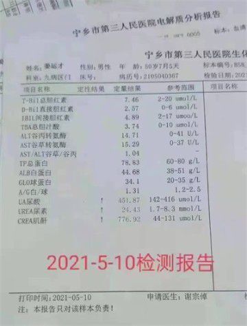 2.家住长沙宁乡市横市镇的姜某,因帕金森病并尿毒症经多地大医院治疗无果,肌肝七百多一直降不下!同时帕金森氏综合症引起手抖及全身性疼痛难忍。经朋友介绍来找黎老先生治疗,来时低头不语,表情呆滞,且没有带一点各医院治疗的病历资料,也没有说半点病情。为什么呢?是他认为各地大医院治疗都没有一点效果,难道这个乡下小医院能有效果吗?同行的朋友替他说了一句:他的肌肝柒佰多一直降不下。当他服了黎老先生一个疗程中药后去复查时证实肌肝降低了五百多,因帕金森病引起的全身难忍的疼痛状症也消失了,这才欣喜万分继续治疗!两个月后经医院检查一切正常了,他便上工地开挖机去了!