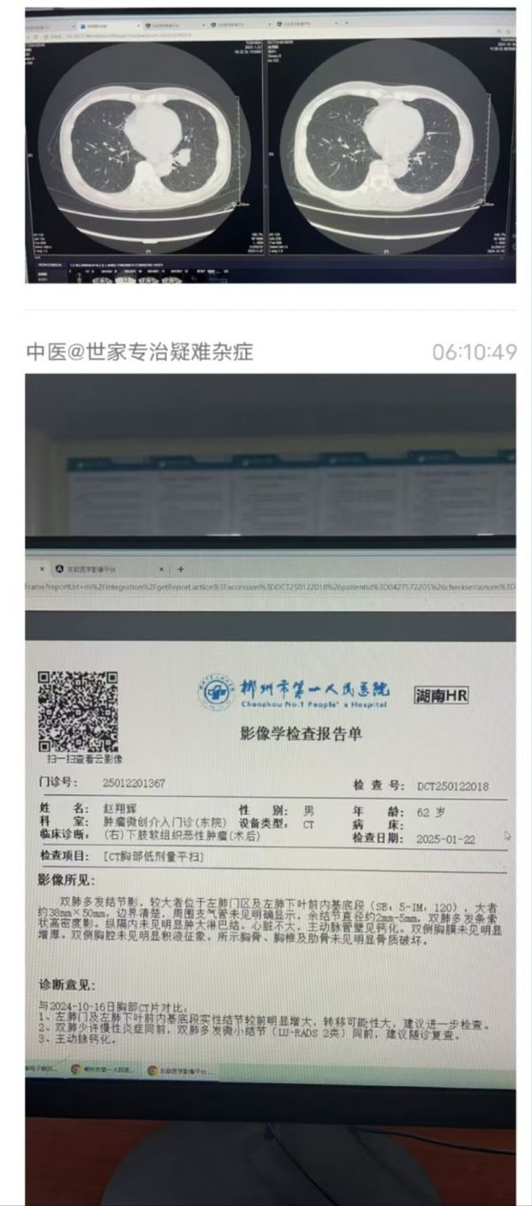 救人一命,胜造七级浮屠!第612案,赵某,男,62岁,住湖南省郴洲市永兴县人,2021年九月因软组织恶性肌肉瘤(之前肠肿瘤曾手术一次)手术后转移出17mm*16mm和直径2mm--5mm的肿瘤和结节块多处,又经放化疗后恶性肿瘤增大到38mm*50mm。后经朋友推荐前来找我行中医药治疗,在接受我的内服和外敷的宫廷秘方中药吃完后咳出了30mm长,直径10mm大的肿瘤体(见上面的截图)要知道患者是经过多地长达五年的开刀,放化疗,吃靶向药治疗使恶性肿瘤越来越大了呀!使用我的秘方中医药三个疗程就将肿瘤体消失了!此案如有不实十万元培偿!当然是还要继续把全身的经络气血和五脏六腑都调理好才能使肿瘤不会复发和转移的!再一次见证了祖国中医救人于危难的卓越功效!欢迎各位爱心人士推荐患者前來咨询,互利互惠合作共赢。
