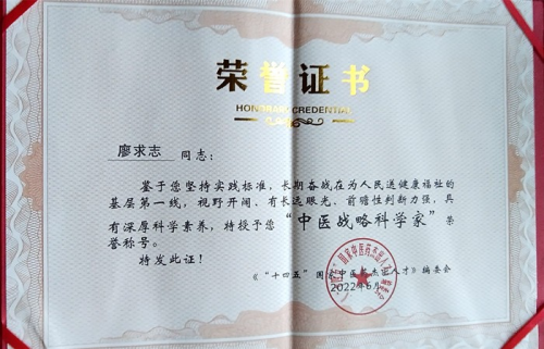健康是人类永恒的追求。实施健康中国战略,是从源头维护人民健康。中医药学凝聚着深邃的哲学智慧和中华民族几千年的健康养生理念及其实践经验,具有独特的生命观、健康观、疾病观、防治观,在健康中国中发挥不可替代作用。中医药起源于民间,立足于基层,无数基层中医人坚守独具匠心的中医情怀、用独特的思维和方法解决了很多疑难病症,用自己高超的医技书写了很多传奇故事。在基层中医这个藏龙卧虎队伍中,国宝级中医——廖求志老师,他是基层中医的一面旗帜,他以“精”“诚”引领自己的医学道路,执着追求,秉承“仁术慈心,修身济众”的信念守护人民健康。是基层群众的健康“守门人”,健康中国路上的筑梦者。