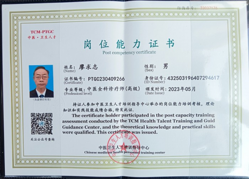 几十年来,廖求志不忘初心,砥砺前行,牢记使命,将全部精力投到医学事业上,潜心专注医学技术的研究,精益求精,把患者能够康复作为毕生最大的追求,敬佑生命,救死扶伤,恪尽职守,甘于奉献。做为一名中国中医传承者,不为名利只为传承,把自已一生辛苦研发出来的特色技术,传承下去。为人类大健康事业贡献力量,把祖国的中医药文化发扬光大!