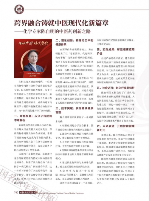 从染料工程师到中医创新的领军者,陈自明用四十余年的跨界坚守,走出了一条以现代科技激活传统医学生命力的特色之路。他的故事表明,中医药的守正创新,需要更多打破学科壁垒的勇气,需要融合前沿科学的智慧,更需要一份让古老智慧惠及当代世界的赤子情怀。在中医药现代化波澜壮阔的征程中,陈自明正以他的探索,执科技之钥匙,努力开启一扇通往岐黄之术新境界的大门。