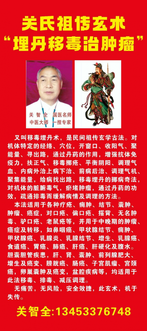 除了在腰椎、颈椎间盘突出治疗上的卓越成就,关智全在其他病症的治疗上也颇有建树。他擅长 “移毒埋丹(移疮挪病法)”,这一民间玄学古法通过在机体特定经络、穴位开窗口、收阳气,借助丹药的作用,实现增抗体、强免疫、扶正气、移毒挪疮、平衡阴阳、调理气血的功效,可内病外治、上病下治、前病后治。该疗法适用于多种病症,包括各种疔疮、痈肿、肿瘤等,在中晚期肿瘤及转移的治疗和调理方面也发挥着重要作用。此外,他在高血压、糖尿病、心脑血管病、各种疼痛、妇科病等诸多疾病的治疗上,都有着独到的见解和方法,为众多患者带来了康复的希望。