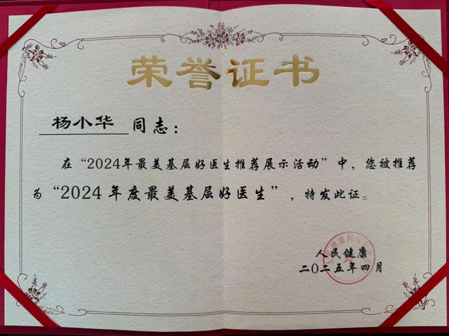 医者有仁心,荣誉自会来。在基层默默耕耘的他,逐渐走进了行业的视野。2019年8月,他被聘为中国医师协会乡村医师分会乡村医师执业工作委员会第一届委员,并获评 “全国优秀基层卫生工作者” 。2022年荣获“全国优秀医生”,2024年再获 “全国基层最美医生” 殊荣 。从清华大学到人民大会堂,从乡村诊所到国医大师的弟子,杨小华的身份在变,荣誉在加,但那份对医学的热爱和对百姓的牵挂从未改变。