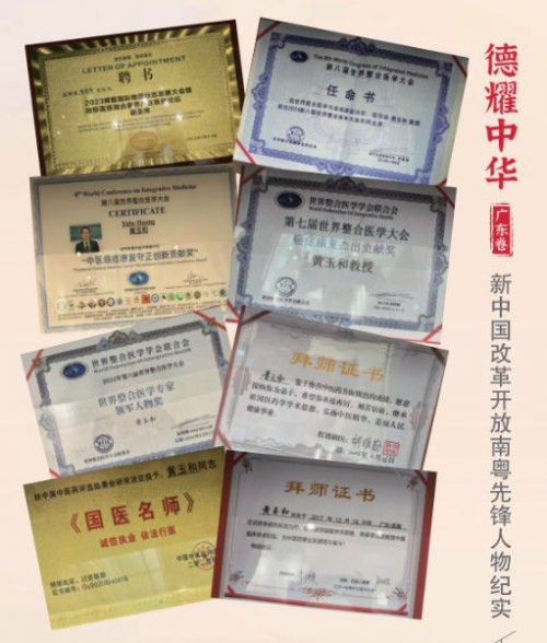 在个人医术精进的同时,黄玉和始终坚持博采众长:2018年他正式拜入国医大师李佃贵门下,同步设立“国医大师李佃贵临床中医药学传承研究工作室——广东省珠海市荔山黄氏承传人黄玉和肿瘤疑难症康复研究实践基地”;2022年被著名脊椎病专家龙层花教授收为弟子;2024年3月又师从国医大师唐祖宣,三位国医、名医的指导,让他的医学理念与诊疗体系进一步得到完善,也让他更坚定了振兴国医、济生救人的理想。