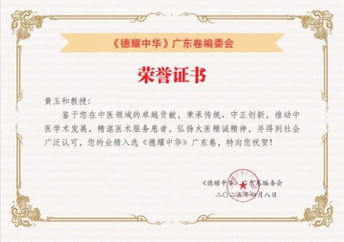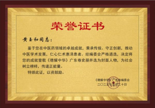 黄玉和的贡献不仅得到了患者的认可,也获得了行业与社会的广泛肯定:他连续担任珠海市政协第三、四届委员,期间多次为中医药事业发展建言献策,推动地方中医药扶持政策的落地;被俞梦孙院士人民健康系统工程聘为专家团队唯一中医专家,同时担任中国老龄事业发展基金会健康中国万里行组委会副主席、中国中医药信息研究会基层医疗服务分会副会长、中国民间中医医药研究开发协会浊毒理论研究分会常务理事等职务。